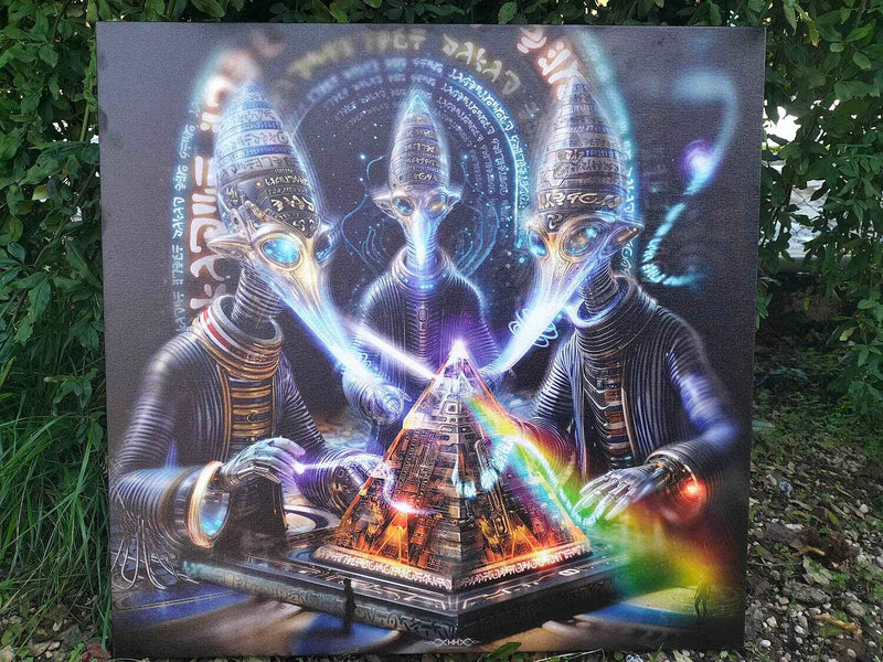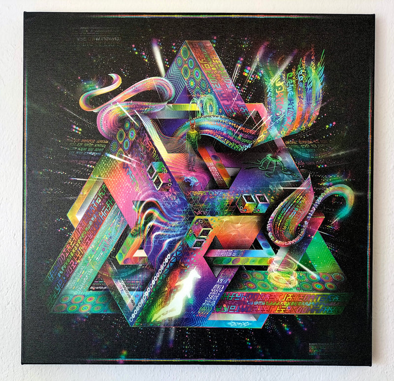 Museum-grade archival paper or premium canvas. Pigment-based inks rated 100+ years. UV-active inks for neon editions.